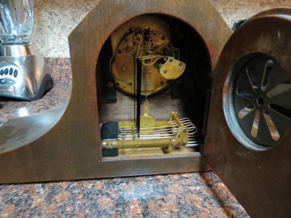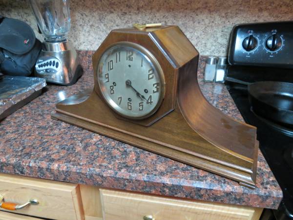 New Haven Mantel Clock, walnut case, works well, unique shape, WESTMINSTER CHIMES, chimes every 15 minutes, Looks very nice. Sounds amazing. LANDLINE