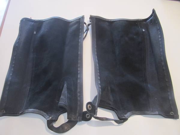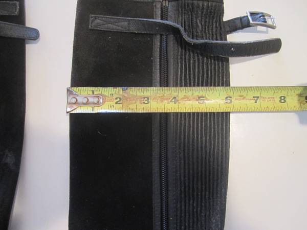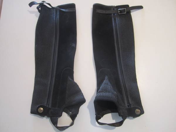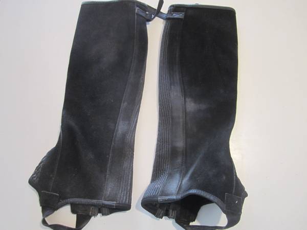 Black Suede 1/2 Chaps with Elastic Gusset, Excellent Condition. 6" at Widest, 16" Long not including foot strap.