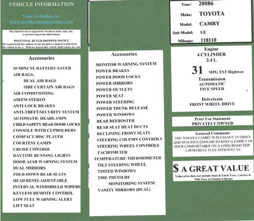 For more details visit our website at www.northernstateauto.com; visit the car lot at 210 S Walnut Street, Elmira, NY or phone