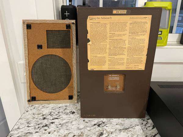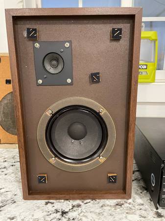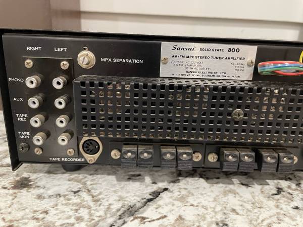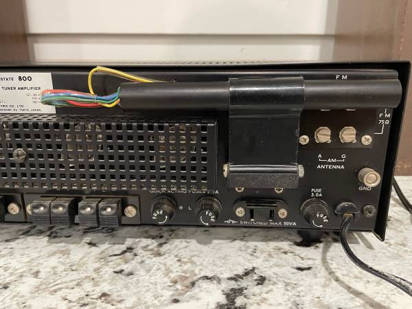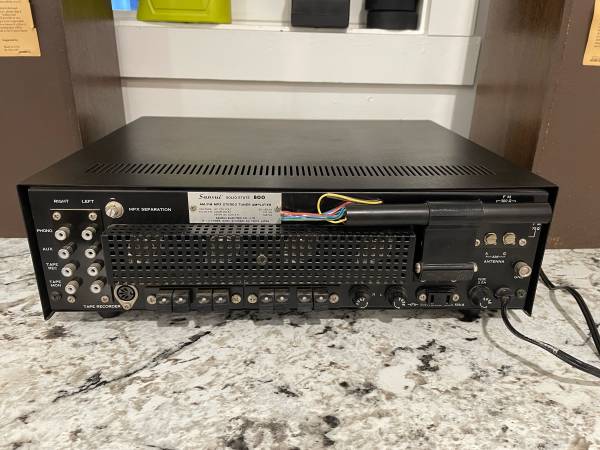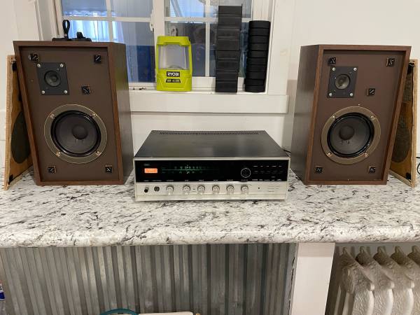 Sansui solid state 800 stereo receiver with The Advent/3 bookshelf speakers all in exceptionally good condition. Sounds great and cosmetically they are extremely good. The one issue is that it appears one or two of the lamps behind the radio dial are burnt out. It’s a cheap easy fix that I just haven’t gotten around to.