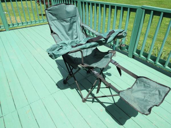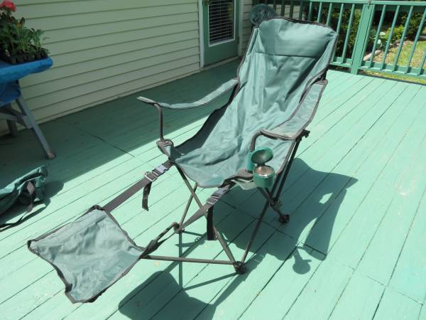 Fold up chair, footrest, cup holder, good for your patio, deck, camping. With carry bag. NO texts, landline.
