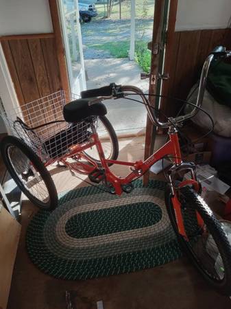 Brand new adult three wheeler with large rear basket. Comes with brand new bike pump with gauge , bike lock , tool kit , cover, Ridden only couple miles. $350. show contact info