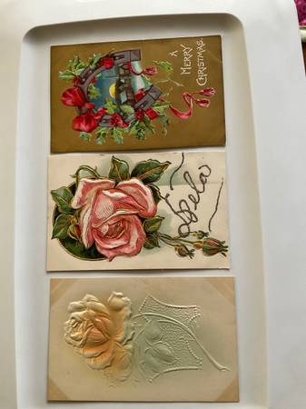 Nine embossed holiday/birthday post cards, from the 1940’s(I believe). $3 each or $20 for all.