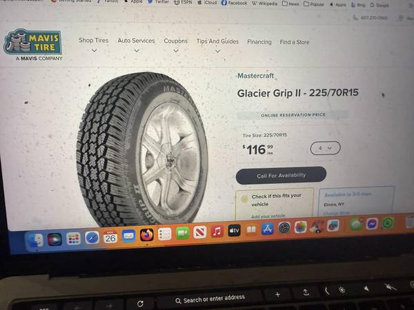 I have 2 Master Craft Glacier Grip 2 Studded Winter tires 225/70R15 that have less then 500 miles on them used for less then a month and been sitting in parents garage for awhile so dusty and dirty These retails right now at Mavis Tire fir t for $116.99 each plus $20 a tire to be studded totaling $295.89 and selling for ONLY $150 FIRM save over $145 right now please look at the pictures and see how great of shape they are. Again these have been sitting awhile but there does not seem to be any dry rot or cracking as they were on a shelf in the garage.Information about tires from Mavis website are below.