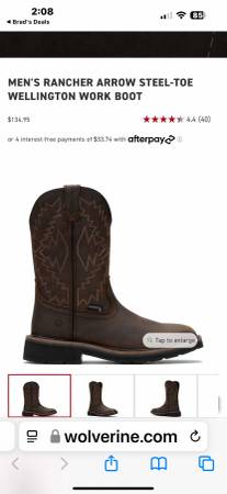 I have a brand new with tags in box Wolverine Mens Rancher Arrow Steel Toe Wellington WorK Boots Size 11 that sell. for $134.95 plus tax totaling $145.74 I am only asking $120. It was bought for Christmas and it is to big. It is past the return policy so I am just trying to get some money back.