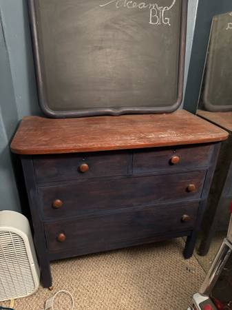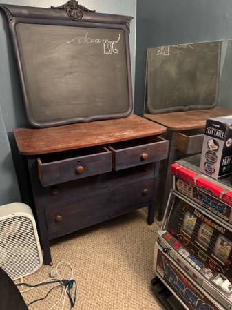 Clean and nice looking refurbished dresser with castor wheels. Solid wood with chalk board mirror. $150 cash only