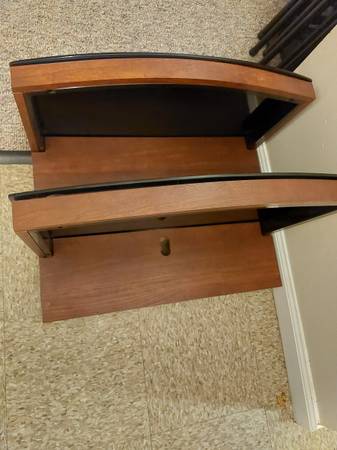 Metal/wood structure, 2 shelfs with glass tops. Detachable/snap-on wood panels for easy cable management.