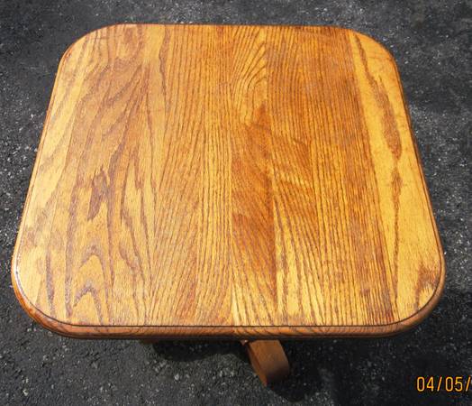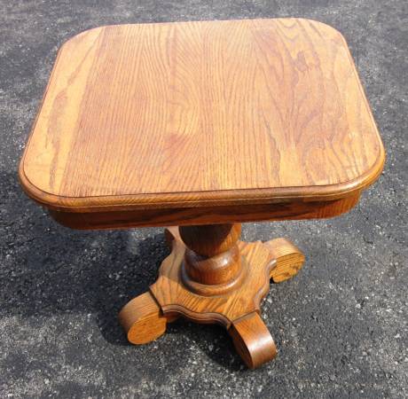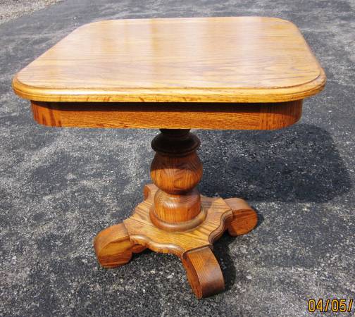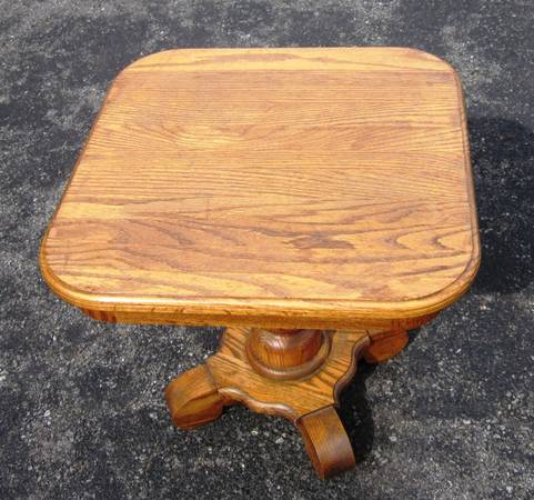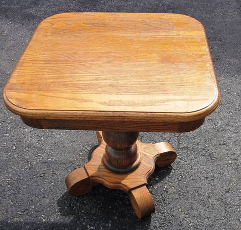 Offered is a solid oak pedestal end table by Heirloom enterprises MADE IN USA