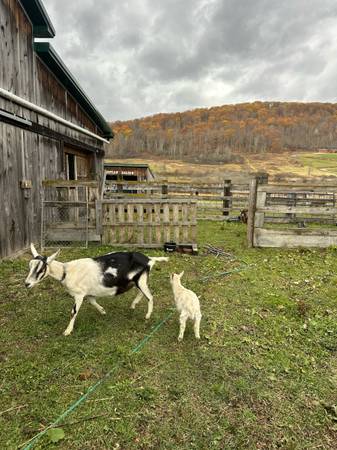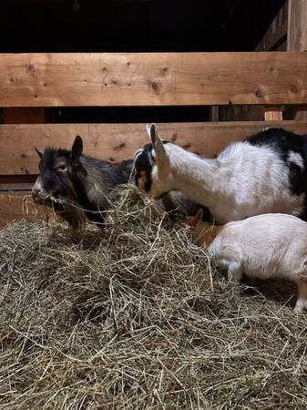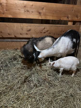 3 goats must stay together. Baby is still milking from mom and mom and dad are imprinted partners! Mom is a Nubian milk goat dad is a Nigerian stud. Baby is a mix of them both. NOT FOR MEAT! These...