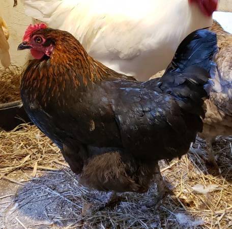 For sale: Marans laying hen. Barredrock mix laying hen and two 5 month old starlight roosters all for $30.