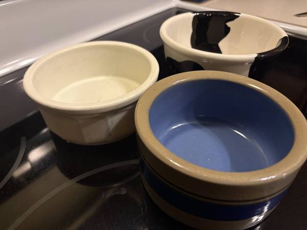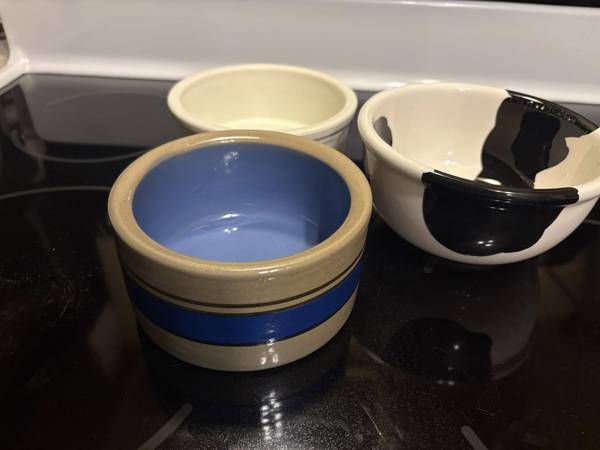 Details: Condition Used - Good Small Food Dishes for Pets Can be used for small dogs, cats, rabbits, hamsters, etc. Two ceramic (blue and cow print) One plastic (white)