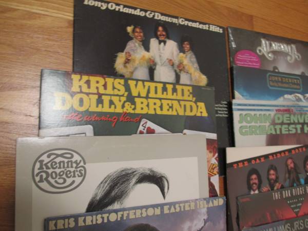 Vintage vinyl records by many artists... J Denver, Mac Davis, Kristofferson, K Rogers, Oakridge boys, Many more. One is by Kris, Willie, Dolly , Brenda. See photos. $4. each. Located in Big Flats.