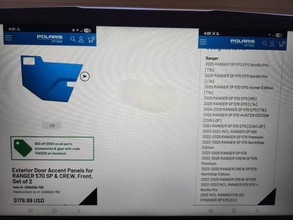 Polaris exterior door accent panels for Ranger 570 SP and crew. New, never installed. See attached pics for full description. Please texts only.