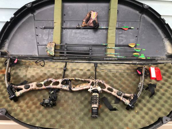 Last call. Set up and ready to go. This bow is in excellent condition. New autumn colored Bow sting waxed . 29-31 inch draw. This Hoyt has 85% let off. Currently set at 60pounds. It shoots over 240 feet per second. Has all the bells and whistles on it. Fiber optic Lighted site with leveler. Silencers, stabilizer bar, over sized peep. Included in this great deal is the bow case, Tru fire release, bow wax, arrow holder, several Beamen arrows. Call /text now if interested. show contact info