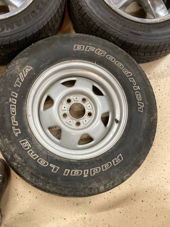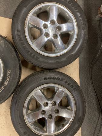 Two 235/60/17 Goodyear Assurance Weather Ready with decent tread on 17” chrome Jeep rims. 5 lug. Also included in the price is a spare 15” wheel, also 5 lug, that fits a lot of Jeeps. Tire tread on spare wheel is shot but it holds air and could serve as an emergency spare. Please call or text 425-8113 between 8am and 8pm (area code 607).